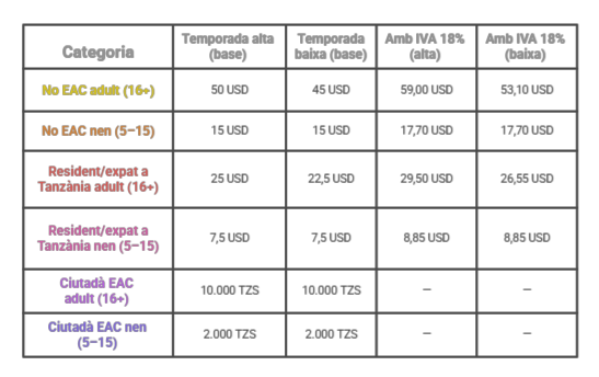 Quant es paga i per què varia. El 2026, la referència habitual per a Arusha (parc “select” del circuit nord) s’expressa per persona i per 24 hores, amb temporada alta i baixa. Sovint veuràs imports “base” i, a més, el càlcul amb IVA.