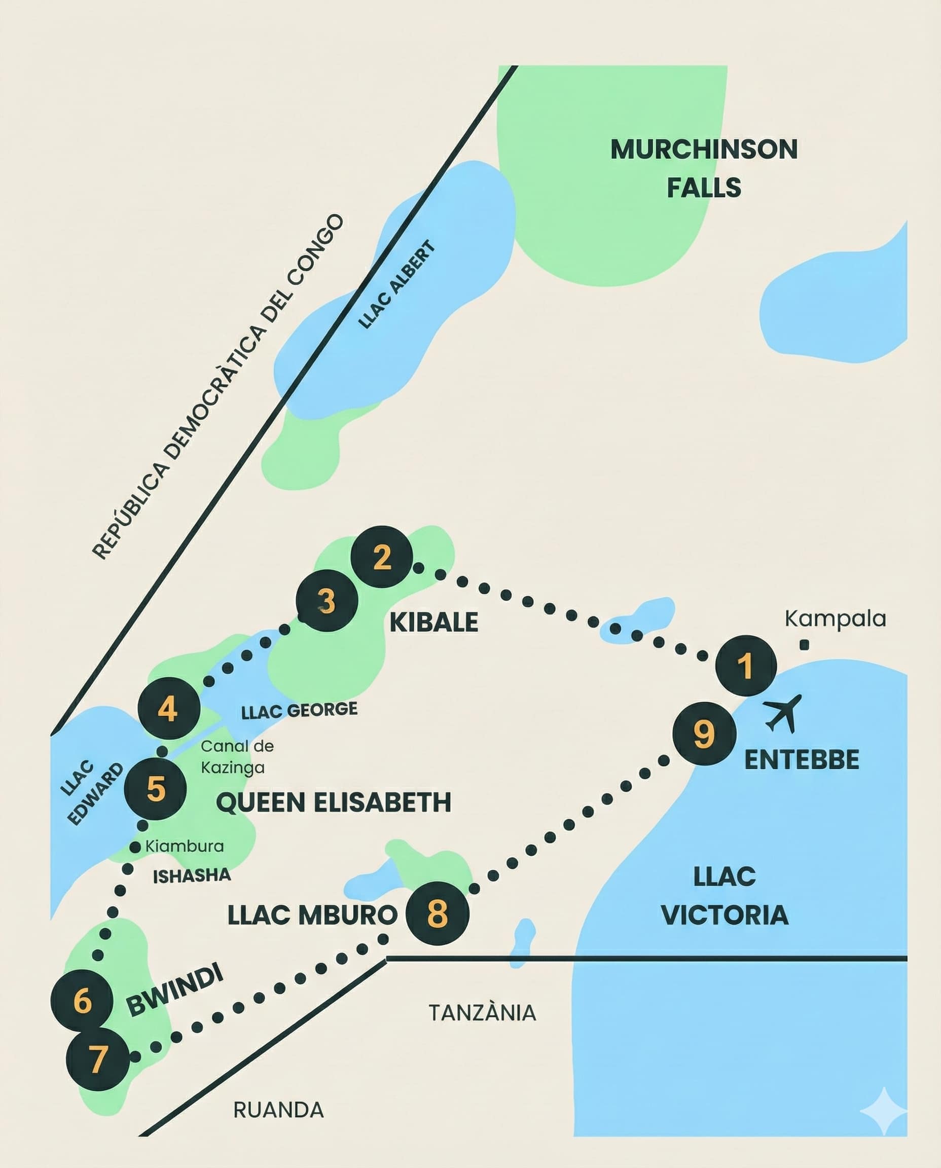 Esmorzar a l’allotjament i trasllat cap a Entebbe (5-6 hores) per agafar el vol internacional. El vol a l’aeroport Internacional d’Entebbe ha de sortir per la tarda a partir de les 17h. *En cas de voler passar el dia a Entebbe té un cost addicional– 72 EUR per persona (inclòs allotjament per deixar l’equipatge i trasllat a l’aeroport) **En cas de quedar-se una nit més a Entebbe té un cost addicional 144 EUR per persona (Hotel a Entebbe o similar sopar i esmorzar + trasllat l’endemà)